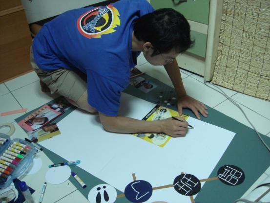 你趴在地上,為我仔細地畫海報。你拿手的POP,是我海報的要角。